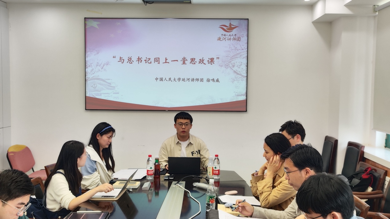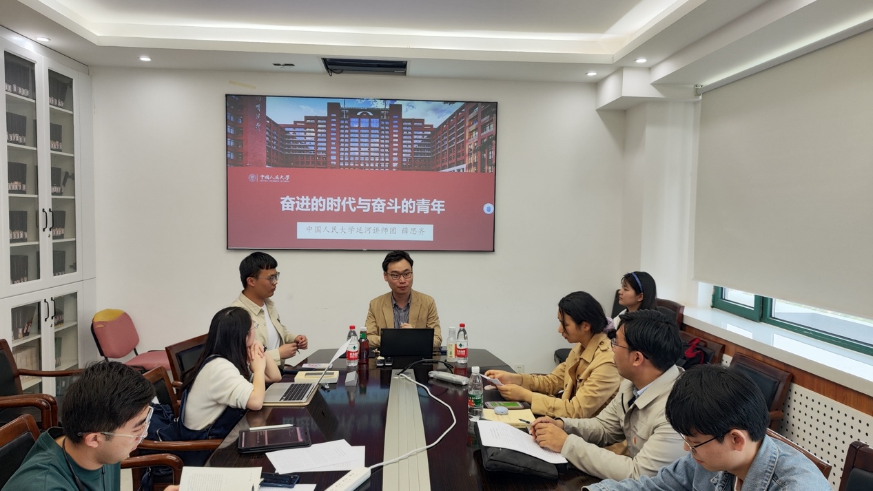 其后,支部邀请延河讲师团徐鸣威和薛思齐两位同志分享自己的经历和感想。徐鸣威同志重点分享了对习近平总书记关于思政课重要作用、中国共产党人精神谱系和寄语青年等的重要讲话的认识,他认为人大青年学子应该深入学习习近平总书记的系列重要讲话精神,践行“复兴栋梁,强国先锋”的青春誓言。薛思齐同志从习近平总书记到中国人民大学考察调研的重要意义讲起,结合中国近现代史、人大校史等分享对青年“在全面建设社会主义现代化国家新征程中勇当开路先锋、争当事业闯将”的理解和认识。